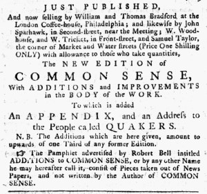 Right next to the Bradfords’ advertisement, as had been the case on other occasions, appeared Bell’s advertisement for “Large ADDITIONS to COMMON SENSE.” Those “ADDITIONS” included “the following interesting subjects,” “American Independency defended by Candidus,” and “The Propriety of Independancy, by Demophilus,” and “Observations on Lord North’s Conciliatory Plan, by Sincerus.” This version of the advertisement added “The American Patriot’s Prayer,” left out of Bell’s previous notice, to entice prospective customers. Bell also pirated “AN APPENDIX TO COMMON SENSE, together with an ADDRESS to the people called QUAKERS, on their Testimony concerning Kings and Government.” Like the Bradfords, he charged “one shilling ONLY” and made “allowance to those who buy quantities.” In other words, the printers of Common Sense and related materials offered discounts to retailers who purchased in volume to sell the pamphlet in their own shops and others who bought multiple copies to distribute to friends, relatives, and associates. The contents of Paine’s political pamphlet made it popular, yet the advertisements in the Pennsylvania Evening Post and other newspapers also helped raise awareness of Common Sense.