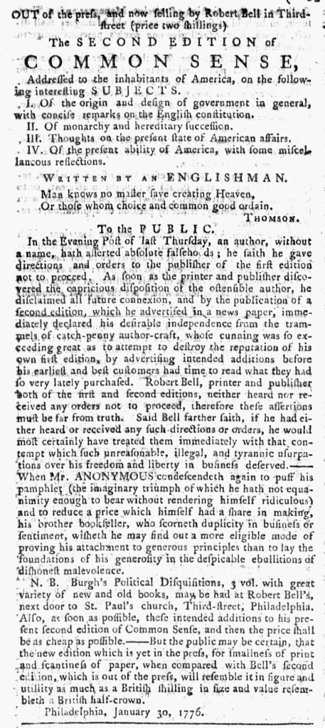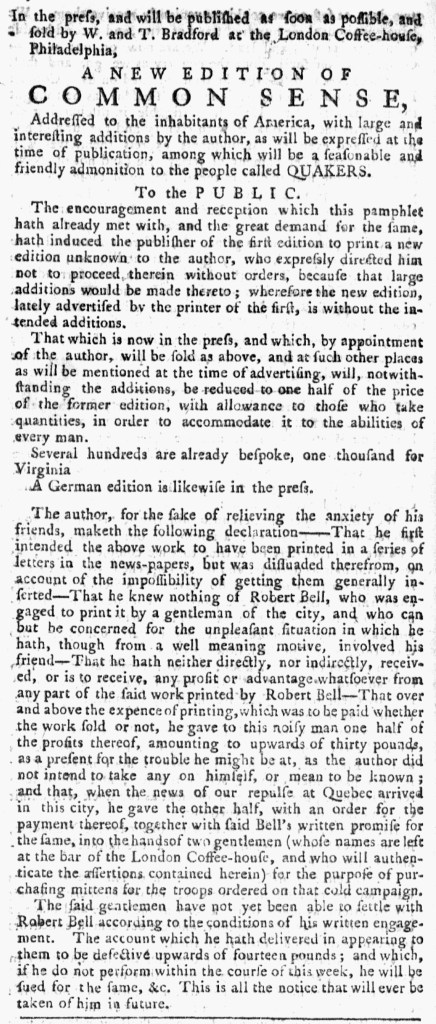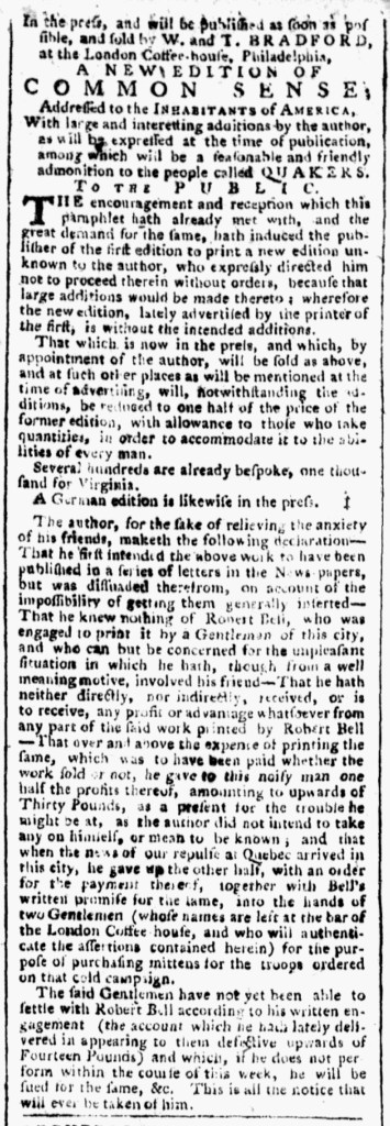 Ebenezer Watson, the printer of the Connecticut Courant and Hartford Weekly Intelligencer, briefly suspended publication of that newspaper due to a lack of paper in late December 1775 and early January 1776. The issue for December 11, “NUMBER 572,” was the last for over a month. The next known issue had neither a date nor a number in the masthead, but the news from Hartford on the final page bore the date January 15. The issue for January 22, “NUMB. 574,” had both a date and number in the masthead. A handwritten note at the bottom of the first page of the December 11 edition digitized for the America’s Historical Newspapers database states, “There appears to be an interruption of four weeks,” consistent with the issue numbering.