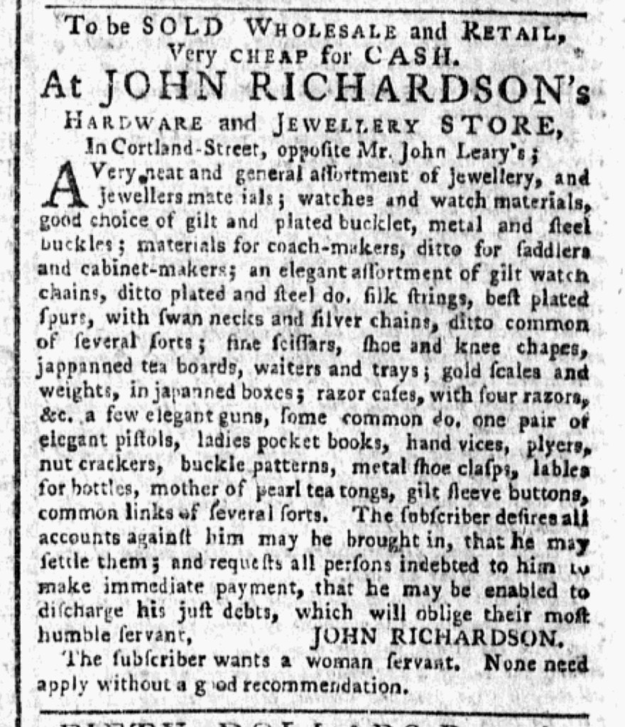 John Richardson ran an advertisement for his “HARDWARE and JEWELLERY STORE” in the February 12, 1776, edition of the New-York Gazette and Weekly Mercury. He was not alone in his marketing efforts. Richard Sause also placed an advertisement for a “JEWELLERY, CUTLERY, HARD-WARE, and HABERDASHERY STORE.” Both emphasized consumer choice as a marketing strategy, but they deployed very different formats in demonstrating the choices they offered to customers.