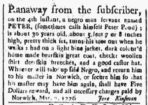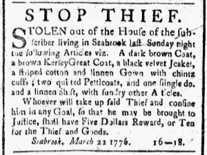 The advertisement had a bold headline: “STOP THIEF.” Those two words likely attracted the attention of many readers of the March 22, 1776, edition of the Essex Gazette. After all, the headlines for most other advertisements gave the name of the advertiser in a large font, such as “Nicholas Pike,” “Abel Morse,” and “John Sawyer,” or named a product being sold, such as “Garden-Seeds” and “Lemmons by the Box.” This advertisement reported on a recent burglary: “STOLEN out of the House of the subscriber living in Seabrook last Sunday night the following Articles … A dark brown Coat, a brown Kersey Great Coat, a black velvet J[ac]ket, a striped cotton and linnen Gown with chintz cuffs; two quilted Petticoats, and one single d[itt]o. and a linnen Shift, with sundry other Articles.”