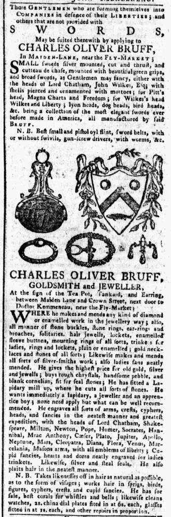 By the time that Charles Oliver Bruff, a goldsmith and jeweler, placed his advertisement in the March 25, 1776, edition of the New-York Gazette and Weekly Mercury he was a veteran advertiser with at least a decade of experience running notices in the public prints in New York. While little direct evidence about the effectiveness of advertising in early America exists, the fact that Bruff repeatedly invested in marketing suggests that he believed that it worked and considered it worth the investment. Indeed, his latest advertisement consisted of two advertisements. The copy for the first one ran as its own notice in the Constitutional Gazette more than six months earlier. As the first anniversary of the battles at Lexington and Concord approached, Bruff once again offered swords to “Those GENTLEMEN who are forming themselves into COMPANIES in defence of their LIBERTIES.”