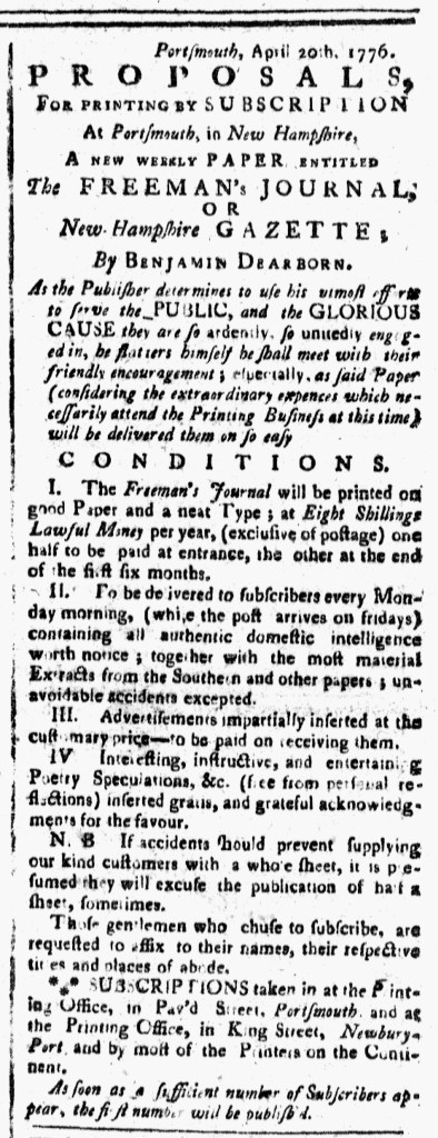 Samuel Hall, the printer of the New-England Chronicle, published the last issue of that newspaper “at his Printing-Office in Stoughton-Hall, HARVARD-COLLEGE,” in Cambridge on April 4, 1776. Three weeks later, he resumed publication “at his Office next to the OLIVER CROMWELL Tavern, in SCHOOL-STREET,” in Boston. The newspaper continued with the same volume and issue numbering. The evacuation of the British and the end of the siege of Boston on March 17 presented an opportunity for Hall to enter the city, making the New-England Chronicle the only newspaper printed in Boston at the time. Benjamin Edes continued publishing the Boston-Gazette in Watertown until late October and returned the newspaper to Boston in early November.