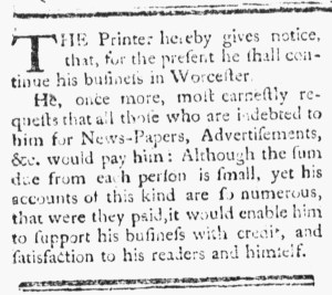 The “CONDITIONS” in Dearborn’s subscription proposals outlined the expectations for the printer and subscribers. A subscription cost “Eight Shillings Lawful Money per year, (exclusive of postage),” with half due immediately and the other half due in six months. Newspaper printers often extended generous credit to subscribers, but circumstances did not permit Dearborn to do so for the Freeman’s Journal. He pledged, “Advertisements impartially inserted at the customary price,” though he did not specify what that was. He apparently expected that prospective advertisers knew the going rate for running notices in newspapers in the region. He did declare that advertisements had “to be paid on receiving them.” The printer did not allow any credit for advertisements.