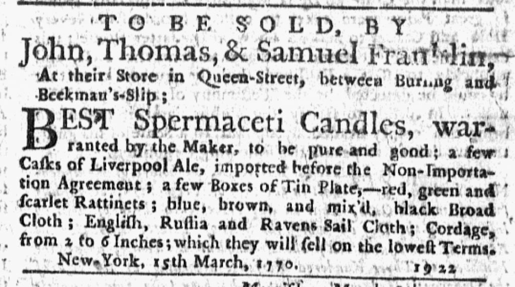 For four weeks in March and April 1770, John, Thomas, and Samuel Franklin inserted an advertisement for “BEST Spermaceti Candles,” “a few Boxes of Tin Plate,” and “red, green and scarlet Rattinets,” along with other goods, in the New-York Journal. Among their wares, they listed “a few Casks of Liverpool Ale, imported before the Non-Importation Agreement.” In so doing, they acknowledged the political movement to boycott goods imported from Britain for as long as Parliament continued to impose duties on imported paper, glass, paint, lead, and tea. Neither the Franklins nor anyone else in New York knew it for certain at the time, but a partial repeal of the Townshend Acts was in the works on the other side of the Atlantic.