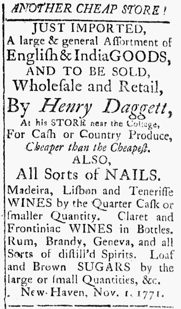 In the fall of 1771, Henry Daggett advertised a “large & general Assortment of English & India GOODS” in the Connecticut Journal. His advertisement in the November 15 edition also listed several different kinds of wines and spirits as well as “Loaf and Brown SUGARS by the large or small Quantities” available at his store near Yale College in New Haven. He offered all of his inventory “Wholesale and Retail,” supplying shopkeepers and selling directly to consumers.