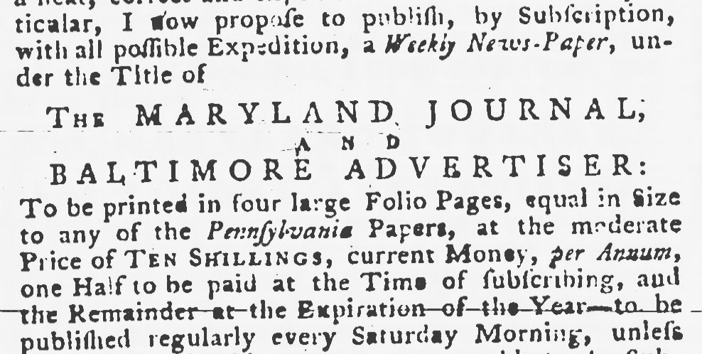 Did the subscription proposal help Goddard to obtain that “sufficient Number of Subscribers barely to defray the Expence” and commence publication? Perhaps, but it took some time. The first issue appeared on August 20, 1773, ten months after Goddard initially proposed publishing the Maryland Journal and Baltimore Advertiser. The newspaper continued publication, under the guidance of various printers and proprietors, throughout the American Revolution and into the 1790s, transitioning from weekly to semi-weekly to tri-weekly to daily as newspaper publishing expanded throughout the new nation.
