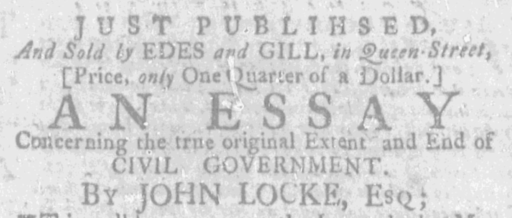In 1773, Benjamin Edes and John Gill, printers of the Boston-Gazette, published an American edition of John Locke’s Essay Concerning the True Original Extent and End of Civil Government, the second of the political philosopher’s Two Treatises of Government. The printers promoted the book in their own newspaper and in the Massachusetts Gazette and Boston Weekly News-Letter.