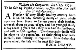 The Slavery Adverts 250 Project chronicles the role of newspaper advertising in perpetuating slavery in the era of the American Revolution. The project seeks to reveal the ubiquity of slavery in eighteenth-century life from New England to Georgia by republishing advertisements about enslaved people – for sale as individuals or in groups, wanted to purchase or for hire for short periods, runaways who liberated themselves, and those who were subsequently captured and confined in jails and workhouses – in daily digests on this site as well as in real time via the @SlaveAdverts250 Twitter feed, utilizing twenty-first-century media to stand in for the print media of the eighteenth century.