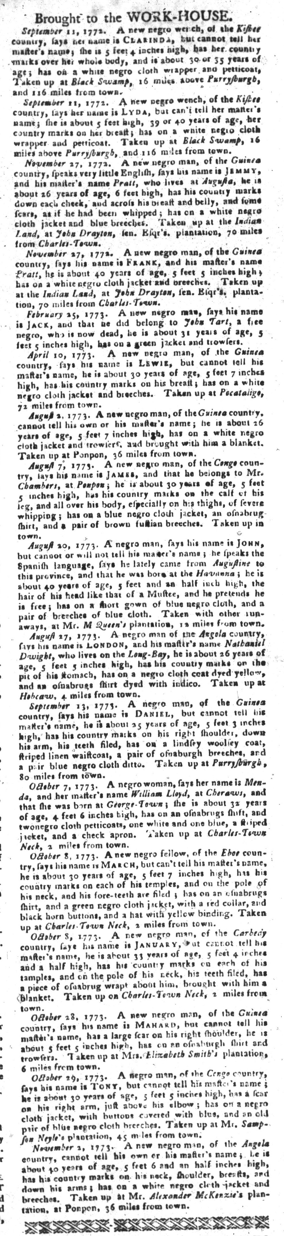 The Slavery Adverts 250 Project chronicles the role of newspaper advertising in perpetuating slavery in the era of the American Revolution. The project seeks to reveal the ubiquity of slavery in eighteenth-century life from New England to Georgia by republishing advertisements about enslaved people – for sale as individuals or in groups, wanted to purchase or for hire for short periods, runaways who liberated themselves, and those who were subsequently captured and confined in jails and workhouses – in daily digests on this site as well as in real time via the @SlaveAdverts250 Twitter feed, utilizing twenty-first-century media to stand in for the print media of the eighteenth century.