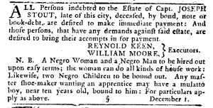 The Slavery Adverts 250 Project chronicles the role of newspaper advertising in perpetuating slavery in the era of the American Revolution. The project seeks to reveal the ubiquity of slavery in eighteenth-century life from New England to Georgia by republishing advertisements about enslaved people – for sale as individuals or in groups, wanted to purchase or for hire for short periods, runaways who liberated themselves, and those who were subsequently captured and confined in jails and workhouses – in daily digests on this site as well as in real time via the @SlaveAdverts250 Twitter feed, utilizing twenty-first-century media to stand in for the print media of the eighteenth century.