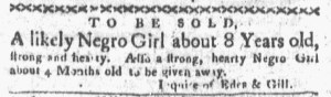 The Slavery Adverts 250 Project chronicles the role of newspaper advertising in perpetuating slavery in the era of the American Revolution. The project seeks to reveal the ubiquity of slavery in eighteenth-century life from New England to Georgia by republishing advertisements about enslaved people – for sale as individuals or in groups, wanted to purchase or for hire for short periods, runaways who liberated themselves, and those who were subsequently captured and confined in jails and workhouses – in daily digests on this site as well as in real time via the @SlaveAdverts250 Twitter feed, utilizing twenty-first-century media to stand in for the print media of the eighteenth century.