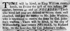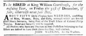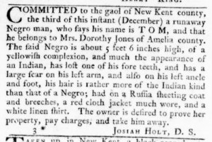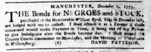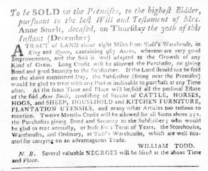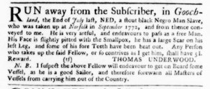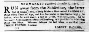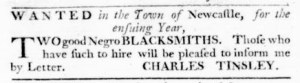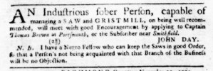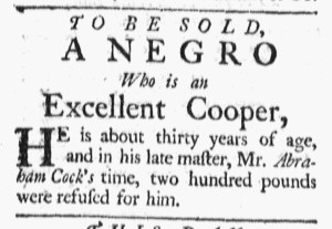 The Slavery Adverts 250 Project chronicles the role of newspaper advertising in perpetuating slavery in the era of the American Revolution. The project seeks to reveal the ubiquity of slavery in eighteenth-century life from New England to Georgia by republishing advertisements about enslaved people – for sale as individuals or in groups, wanted to purchase or for hire for short periods, runaways who liberated themselves, and those who were subsequently captured and confined in jails and workhouses – in daily digests on this site as well as in real time via the @SlaveAdverts250 Twitter feed, utilizing twenty-first-century media to stand in for the print media of the eighteenth century.