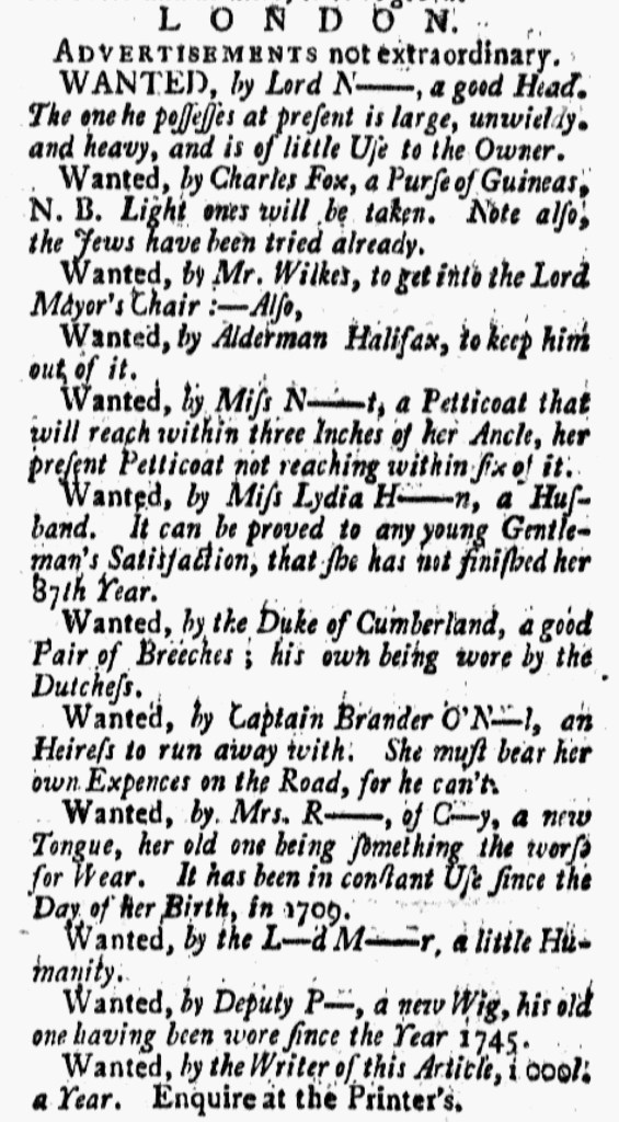 “WANTED, by Lord N—, a good Head. The one he possesses at present, unwieldy, and heavy, and is of little Use to the Owner.”