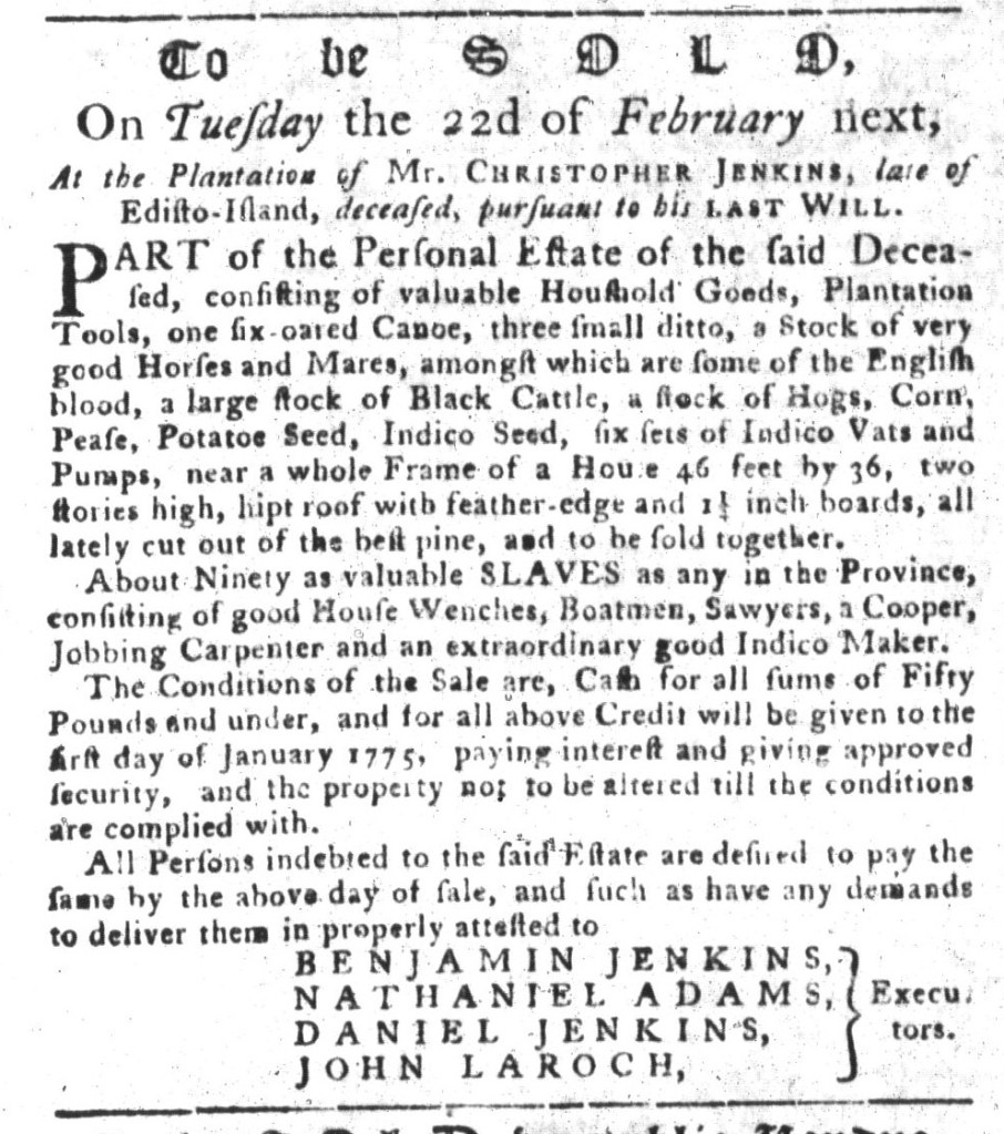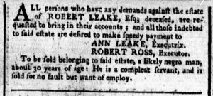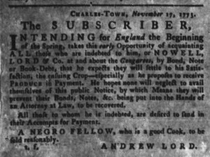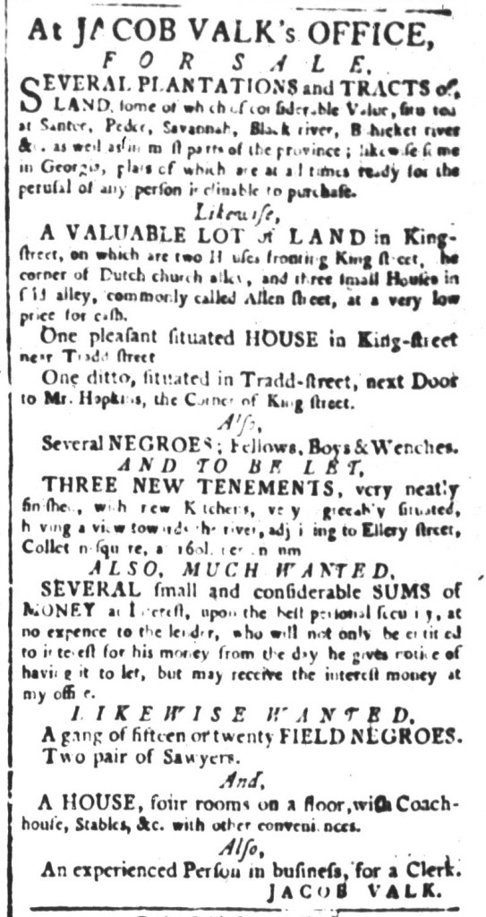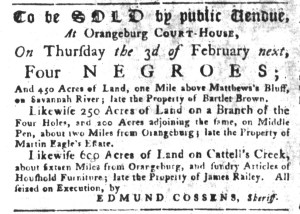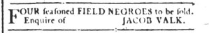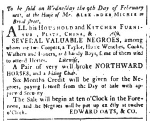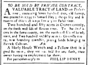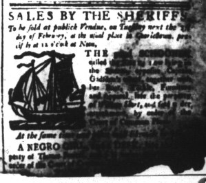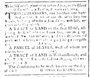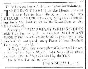 This advertisement offered a shipment from London of “beaver coatings,” fabrics, and blankets. John Bours sold all of these items at a shop that had a golden eagle on the sign. One of the specific items that Bours advertised was kersey, multiple colors of it even. After some research, I found that kersey was a fabric often used in making clothing for enslaved people. Talya Housman, a Ph.D. candidate at Brown University, places kersey with other fabrics in the category of “negro cloth” or “slave cloth.” Not only were these fabrics used to clothe enslaved people, but they were also used as a way “to mark people as enslaved.”