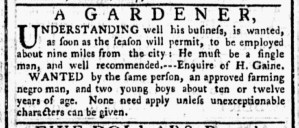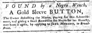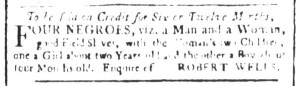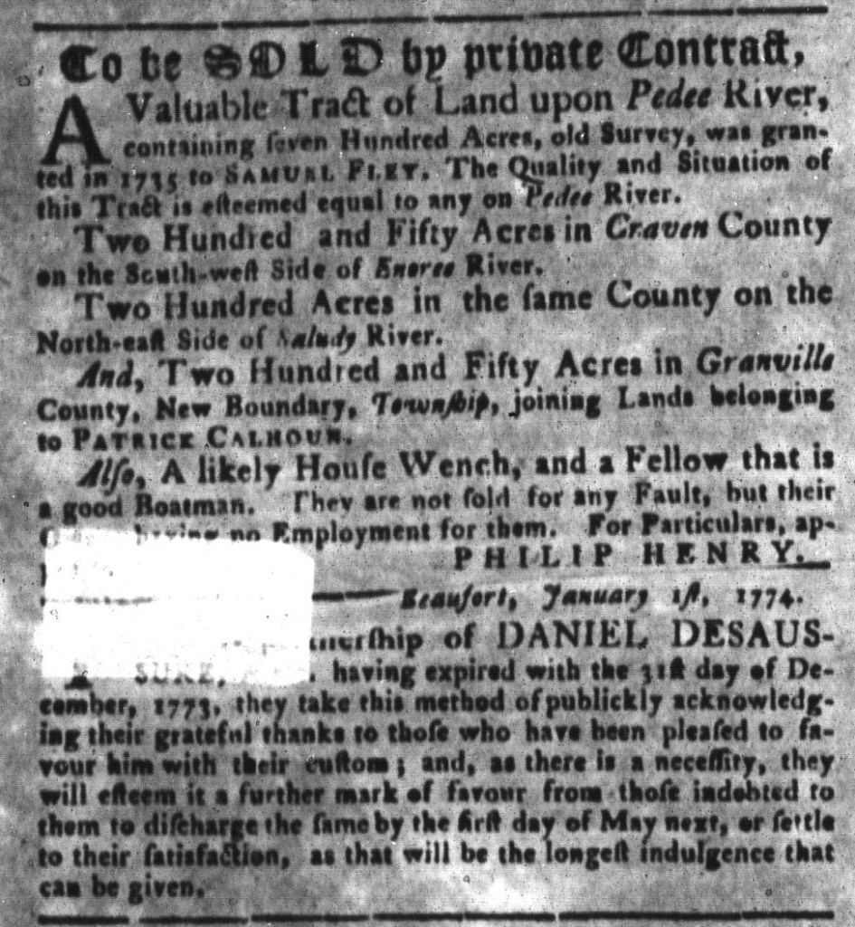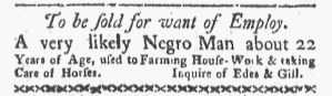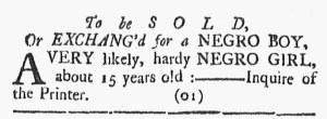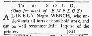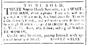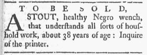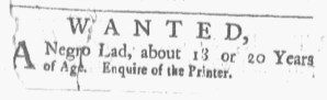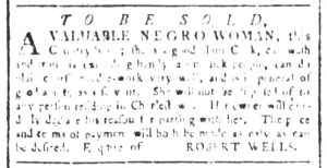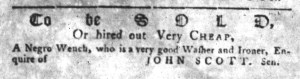 In the course of her duties as guest curator for the Slavery Adverts 250 Project this week, Madeleine identified three advertisements about enslaved people that appeared in the January 31, 1774, edition of the Newport Mercury along with Bours’s advertisement. A notice on the front page offered a “STOUT, healthy Negro” woman for sale. On the final page, an advertisement seeking to sell a “LIKELY Negro” woman, “who understands all sorts of household work,” ran immediately to the left of Bours’s notice. Another notice, this one aiming to sell a “VERY likely, hardy NEGRO GIRL, about 15 years old,” or exchange her for a “NEGRO BOY,” appeared at the top of the column that contained Bours’s advertisement.
