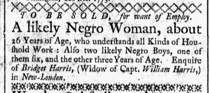 The Slavery Adverts 250 Project chronicles the role of newspaper advertising in perpetuating slavery in the era of the American Revolution. The project seeks to reveal the ubiquity of slavery in eighteenth-century life from New England to Georgia by republishing advertisements about enslaved people – for sale as individuals or in groups, wanted to purchase or for hire for short periods, runaways who liberated themselves, and those who were subsequently captured and confined in jails and workhouses – in daily digests on this site as well as in real time via the @SlaveAdverts250 Twitter feed, utilizing twenty-first-century media to stand in for the print media of the eighteenth century.