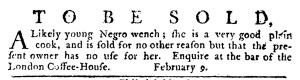 The Slavery Adverts 250 Project chronicles the role of newspaper advertising in perpetuating slavery in the era of the American Revolution. The project seeks to reveal the ubiquity of slavery in eighteenth-century life from New England to Georgia by republishing advertisements about enslaved people – for sale as individuals or in groups, wanted to purchase or for hire for short periods, runaways who liberated themselves, and those who were subsequently captured and confined in jails and workhouses – in daily digests on this site as well as in real time via the @SlaveAdverts250 Twitter feed, utilizing twenty-first-century media to stand in for the print media of the eighteenth century.