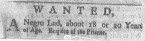 The Slavery Adverts 250 Project chronicles the role of newspaper advertising in perpetuating slavery in the era of the American Revolution. The project seeks to reveal the ubiquity of slavery in eighteenth-century life from New England to Georgia by republishing advertisements about enslaved people – for sale as individuals or in groups, wanted to purchase or for hire for short periods, runaways who liberated themselves, and those who were subsequently captured and confined in jails and workhouses – in daily digests on this site as well as in real time via the @SlaveAdverts250 Twitter feed, utilizing twenty-first-century media to stand in for the print media of the eighteenth century.