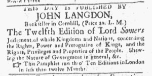 That report, however, may have contributed to colonizers overestimating how much the general public on the other side of the Atlantic supported them in their disputes with George III and Parliament.  In Misinformation Nation: Foreign News and the Politics of Truth in Revolutionary America, Jordan E. Taylor argues that American newspapers selectively published reports from London, creating narratives of recent events that matched the ideologies of the printers.  Langdon’s note at the end of his advertisement for a political pamphlet used to support the American cause may have buttressed the narrative that Benjamin Edes and John Gill advanced in the news items and editorials they published elsewhere in the Boston-Gazette.  Declaring that The Judgment of Whole Kingdoms and Nations sold so rapidly in London suggested widespread support for the principles it contained as well as applying them to the American colonies.
