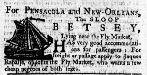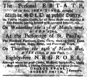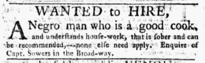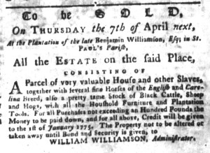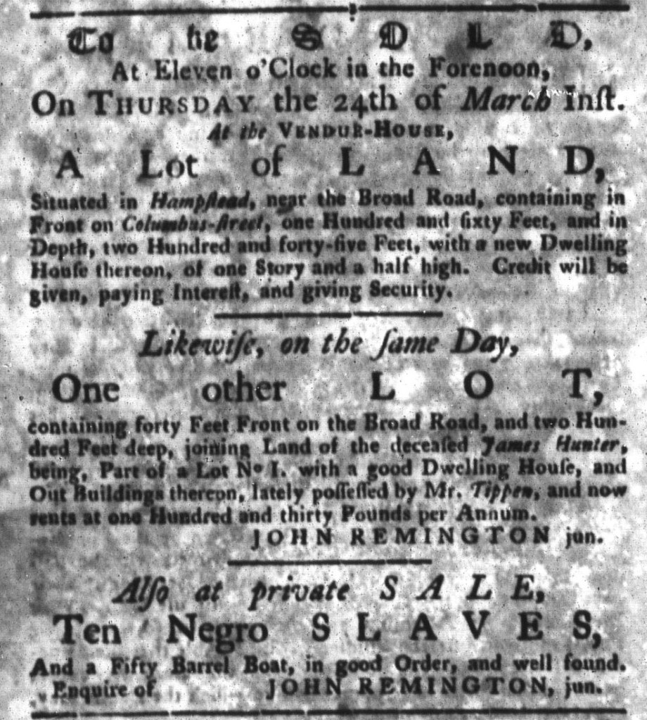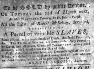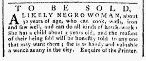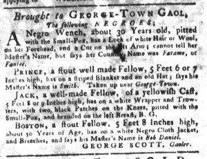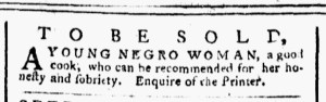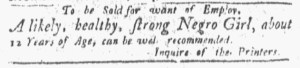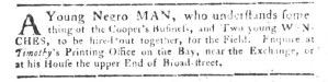 The Slavery Adverts 250 Project chronicles the role of newspaper advertising in perpetuating slavery in the era of the American Revolution. The project seeks to reveal the ubiquity of slavery in eighteenth-century life from New England to Georgia by republishing advertisements about enslaved people – for sale as individuals or in groups, wanted to purchase or for hire for short periods, runaways who liberated themselves, and those who were subsequently captured and confined in jails and workhouses – in daily digests on this site as well as in real time via the @SlaveAdverts250 Twitter feed, utilizing twenty-first-century media to stand in for the print media of the eighteenth century.