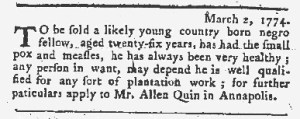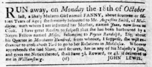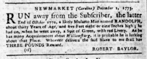 The Slavery Adverts 250 Project chronicles the role of newspaper advertising in perpetuating slavery in the era of the American Revolution. The project seeks to reveal the ubiquity of slavery in eighteenth-century life from New England to Georgia by republishing advertisements about enslaved people – for sale as individuals or in groups, wanted to purchase or for hire for short periods, runaways who liberated themselves, and those who were subsequently captured and confined in jails and workhouses – in daily digests on this site as well as in real time via the @SlaveAdverts250 Twitter feed, utilizing twenty-first-century media to stand in for the print media of the eighteenth century.