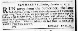 The Slavery Adverts 250 Project chronicles the role of newspaper advertising in perpetuating slavery in the era of the American Revolution. The project seeks to reveal the ubiquity of slavery in eighteenth-century life from New England to Georgia by republishing advertisements about enslaved people – for sale as individuals or in groups, wanted to purchase or for hire for short periods, runaways who liberated themselves, and those who were subsequently captured and confined in jails and workhouses – in daily digests on this site as well as in real time via the @SlaveAdverts250 Twitter feed, utilizing twenty-first-century media to stand in for the print media of the eighteenth century.