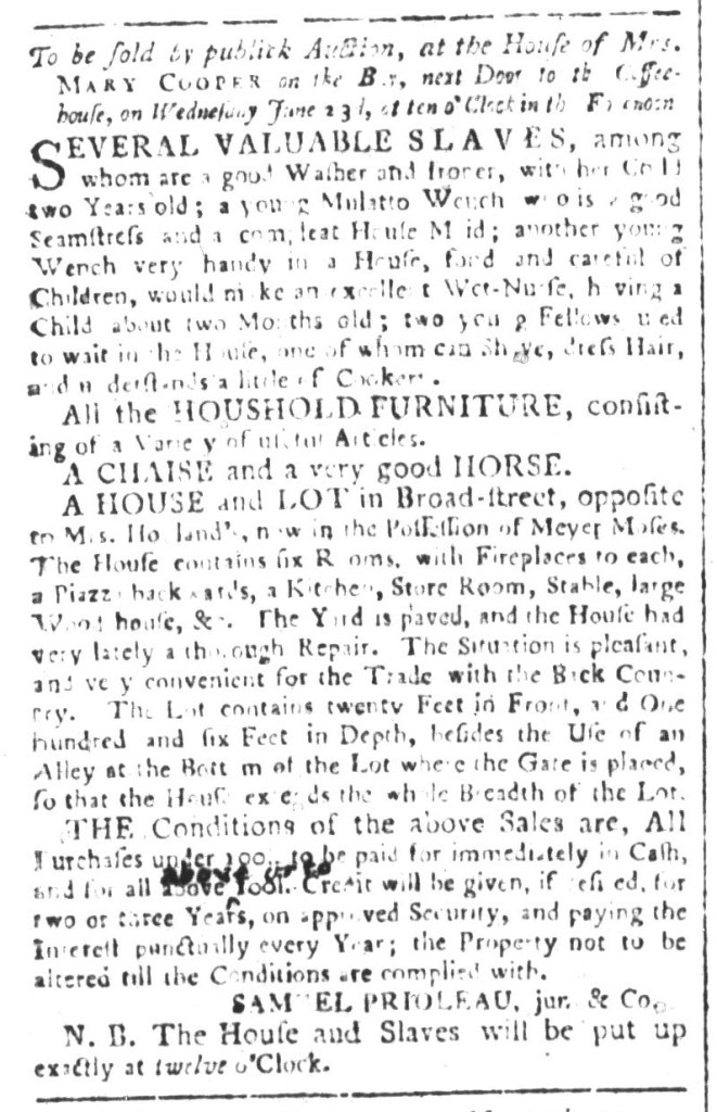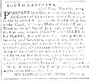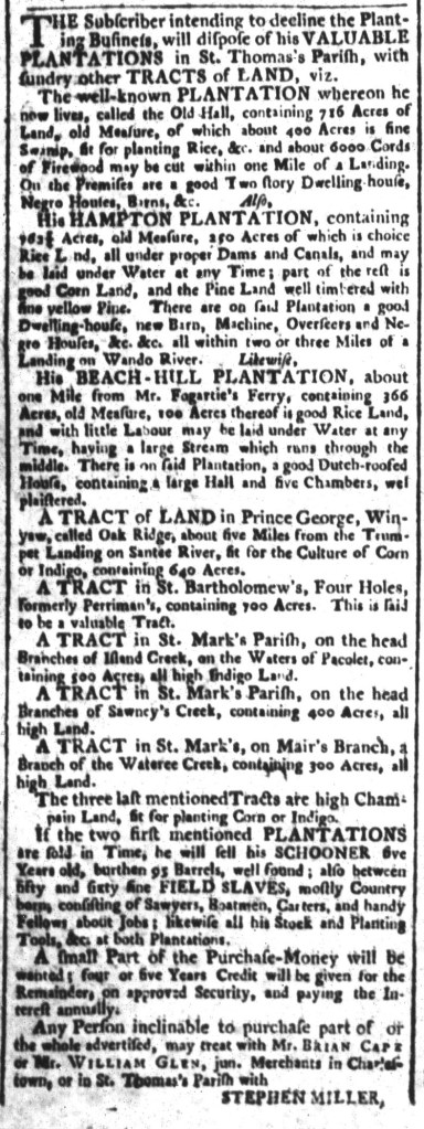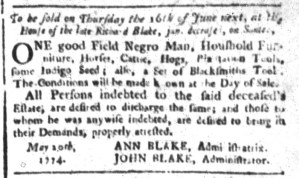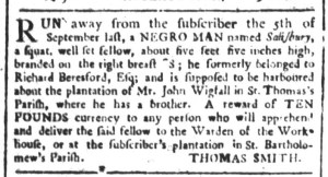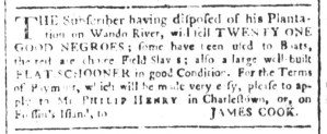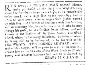 Vose was not alone in placing such advertisements in multiple newspapers. At the same time that he sought to enlist the aid of other colonizers in securing an enslaved youth who liberated himself, Charles Ogilvie ran advertisement about “a Negro Man named MINOS” in the South-Carolina and American General Gazette on May 27, the South-Carolina Gazette on May 30, and the South-Carolina Gazette and Country Journal on May 31. That accounted for every newspaper published in Charleston and the rest of the colony at the time. Ogilvie had recently purchased Minos “at Mr. Benjamin Wigfall’s Sale,” but Minos had other ideas. The enslaver suspected that Minos had assistance from “his Wife at Mr. Elias Wigfall’s” or his “many Relations” in the “Parishes of St. James, Santee, and Christ Church,” believing that they “harboured” or hid him. Although not his purpose in placing the advertisement, Ogilvie revealed one of Minos’s likely motivations for liberating himself.