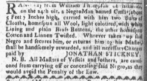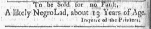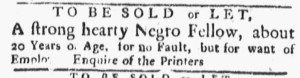 The Slavery Adverts 250 Project chronicles the role of newspaper advertising in perpetuating slavery in the era of the American Revolution. The project seeks to reveal the ubiquity of slavery in eighteenth-century life from New England to Georgia by republishing advertisements about enslaved people – for sale as individuals or in groups, wanted to purchase or for hire for short periods, runaways who liberated themselves, and those who were subsequently captured and confined in jails and workhouses – in daily digests on this site as well as in real time via the @SlaveAdverts250 Twitter feed, utilizing twenty-first-century media to stand in for the print media of the eighteenth century.