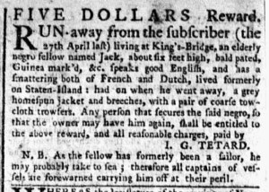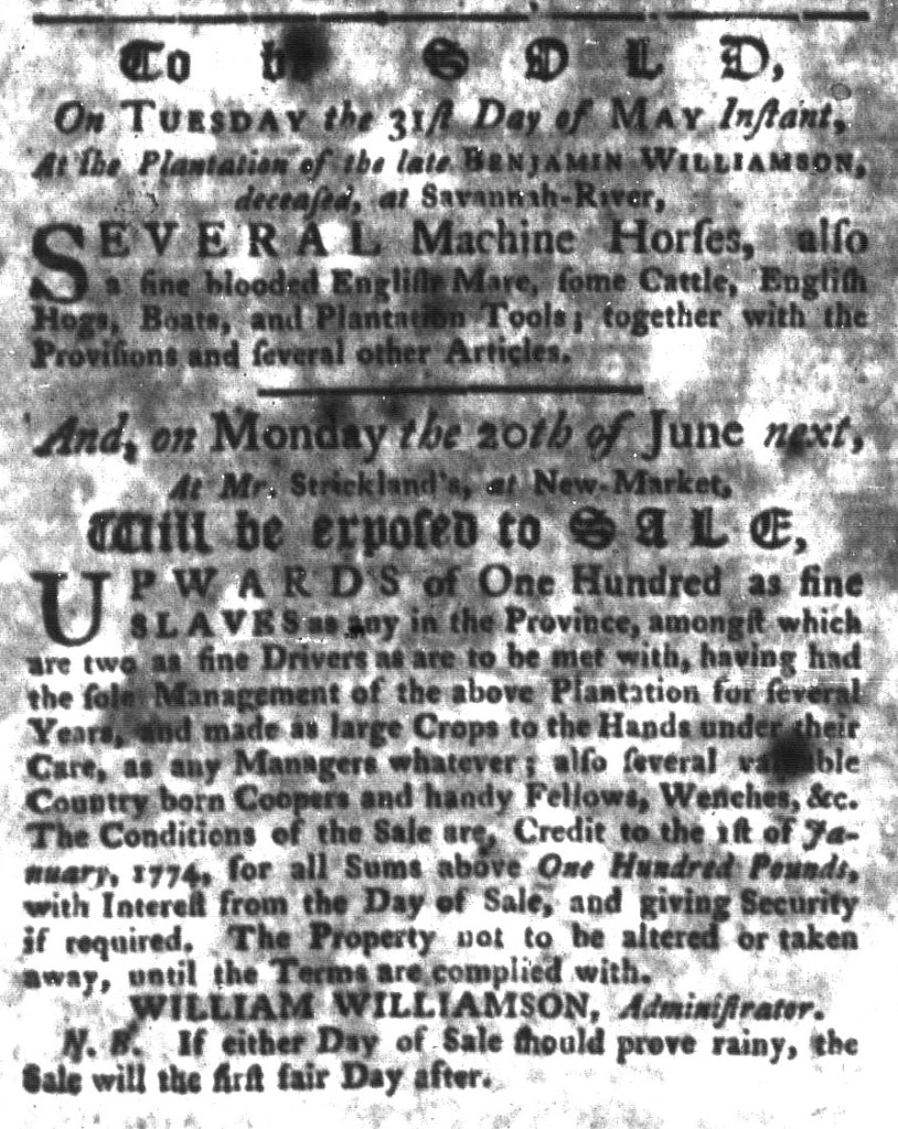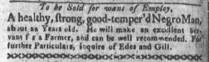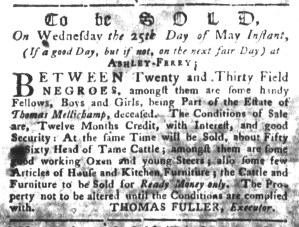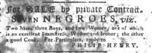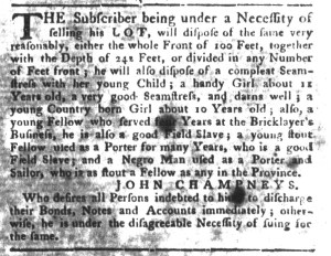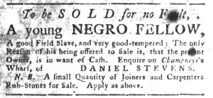 The Slavery Adverts 250 Project chronicles the role of newspaper advertising in perpetuating slavery in the era of the American Revolution. The project seeks to reveal the ubiquity of slavery in eighteenth-century life from New England to Georgia by republishing advertisements about enslaved people – for sale as individuals or in groups, wanted to purchase or for hire for short periods, runaways who liberated themselves, and those who were subsequently captured and confined in jails and workhouses – in daily digests on this site as well as in real time via the @SlaveAdverts250 Twitter feed, utilizing twenty-first-century media to stand in for the print media of the eighteenth century.