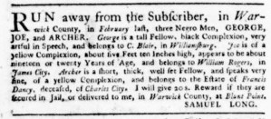 The Slavery Adverts 250 Project chronicles the role of newspaper advertising in perpetuating slavery in the era of the American Revolution. The project seeks to reveal the ubiquity of slavery in eighteenth-century life from New England to Georgia by republishing advertisements about enslaved people – for sale as individuals or in groups, wanted to purchase or for hire for short periods, runaways who liberated themselves, and those who were subsequently captured and confined in jails and workhouses – in daily digests on this site as well as in real time via the @SlaveAdverts250 Twitter feed, utilizing twenty-first-century media to stand in for the print media of the eighteenth century.