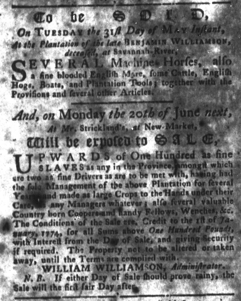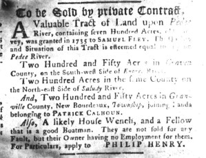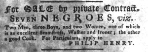 The Slavery Adverts 250 Project chronicles the role of newspaper advertising in perpetuating slavery in the era of the American Revolution. The project seeks to reveal the ubiquity of slavery in eighteenth-century life from New England to Georgia by republishing advertisements about enslaved people – for sale as individuals or in groups, wanted to purchase or for hire for short periods, runaways who liberated themselves, and those who were subsequently captured and confined in jails and workhouses – in daily digests on this site as well as in real time via the @SlaveAdverts250 Twitter feed, utilizing twenty-first-century media to stand in for the print media of the eighteenth century.