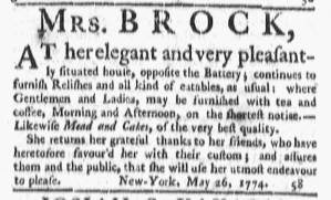 Mrs. Brock invited “Gentlemen and Ladies” to gather at “her elegant and very pleasantly situated house, opposite the Battery,” in New York in the spring of 1774. In an advertisement in the May 26 edition of Rivington’s New-York Gazetteer, she declared that she “continues to furnish Relishes and all kinds of eatables, as usual.” She also served “Mead and Cakes, of the very best quality.” The hostess also took the opportunity to express “her grateful thanks to her friends, who have heretofore favour’d her with their custom.” Brock had been in business for at least five years, having previously advertised in the New-York Journal. Given the reputation she had cultivated during that time, she assured her existing clientele and the public “that she will use her utmost endeavour to please.”