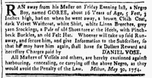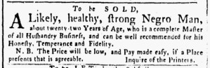 The Slavery Adverts 250 Project chronicles the role of newspaper advertising in perpetuating slavery in the era of the American Revolution. The project seeks to reveal the ubiquity of slavery in eighteenth-century life from New England to Georgia by republishing advertisements about enslaved people – for sale as individuals or in groups, wanted to purchase or for hire for short periods, runaways who liberated themselves, and those who were subsequently captured and confined in jails and workhouses – in daily digests on this site as well as in real time via the @SlaveAdverts250 Twitter feed, utilizing twenty-first-century media to stand in for the print media of the eighteenth century.
