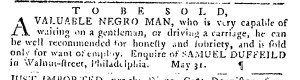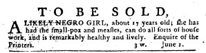 The Slavery Adverts 250 Project chronicles the role of newspaper advertising in perpetuating slavery in the era of the American Revolution. The project seeks to reveal the ubiquity of slavery in eighteenth-century life from New England to Georgia by republishing advertisements about enslaved people – for sale as individuals or in groups, wanted to purchase or for hire for short periods, runaways who liberated themselves, and those who were subsequently captured and confined in jails and workhouses – in daily digests on this site as well as in real time via the @SlaveAdverts250 Twitter feed, utilizing twenty-first-century media to stand in for the print media of the eighteenth century.