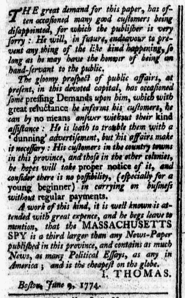 Printers and other entrepreneurs often published notices calling on customers and associates to settle accounts. Isaiah Thomas, the printer of the Massachusetts Spy, did so in June 1774, though he confessed that he “is loath to trouble them with a ‘dunning’ advertisement.” Still, “his affairs make it necessary.” Many printers threatened legal action against those who did not submit payment, but Thomas opted for a different strategy. His “‘dunning’ advertisement” focused primarily on the service to the public he provided in publishing the Massachusetts Spy, especially considering the “gloomy prospect of public affairs, at present.” Readers knew, of course, that he referred to the Boston Port Act that initiated a blockade of the harbor and halted trade at the beginning of the month as well as a series of troubling events over the past decade.