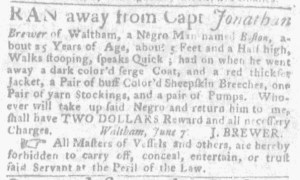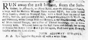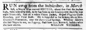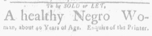 The Slavery Adverts 250 Project chronicles the role of newspaper advertising in perpetuating slavery in the era of the American Revolution. The project seeks to reveal the ubiquity of slavery in eighteenth-century life from New England to Georgia by republishing advertisements about enslaved people – for sale as individuals or in groups, wanted to purchase or for hire for short periods, runaways who liberated themselves, and those who were subsequently captured and confined in jails and workhouses – in daily digests on this site as well as in real time via the @SlaveAdverts250 Twitter feed, utilizing twenty-first-century media to stand in for the print media of the eighteenth century.