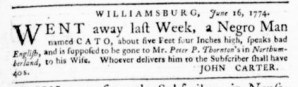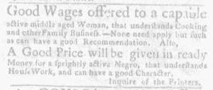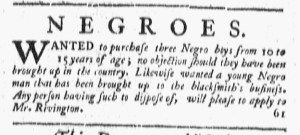 The Slavery Adverts 250 Project chronicles the role of newspaper advertising in perpetuating slavery in the era of the American Revolution. The project seeks to reveal the ubiquity of slavery in eighteenth-century life from New England to Georgia by republishing advertisements about enslaved people – for sale as individuals or in groups, wanted to purchase or for hire for short periods, runaways who liberated themselves, and those who were subsequently captured and confined in jails and workhouses – in daily digests on this site as well as in real time via the @SlaveAdverts250 Twitter feed, utilizing twenty-first-century media to stand in for the print media of the eighteenth century.