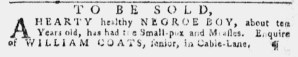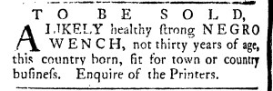 The Slavery Adverts 250 Project chronicles the role of newspaper advertising in perpetuating slavery in the era of the American Revolution. The project seeks to reveal the ubiquity of slavery in eighteenth-century life from New England to Georgia by republishing advertisements about enslaved people – for sale as individuals or in groups, wanted to purchase or for hire for short periods, runaways who liberated themselves, and those who were subsequently captured and confined in jails and workhouses – in daily digests on this site as well as in real time via the @SlaveAdverts250 Twitter feed, utilizing twenty-first-century media to stand in for the print media of the eighteenth century.