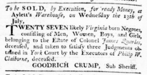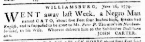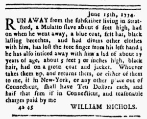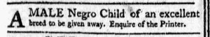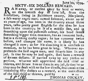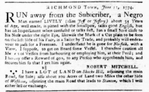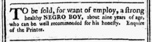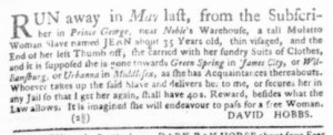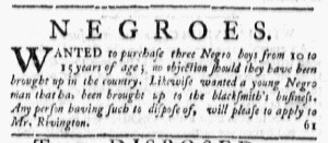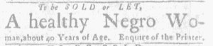 The Slavery Adverts 250 Project chronicles the role of newspaper advertising in perpetuating slavery in the era of the American Revolution. The project seeks to reveal the ubiquity of slavery in eighteenth-century life from New England to Georgia by republishing advertisements about enslaved people – for sale as individuals or in groups, wanted to purchase or for hire for short periods, runaways who liberated themselves, and those who were subsequently captured and confined in jails and workhouses – in daily digests on this site as well as in real time via the @SlaveAdverts250 Twitter feed, utilizing twenty-first-century media to stand in for the print media of the eighteenth century.