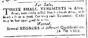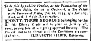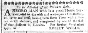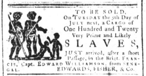 The Slavery Adverts 250 Project chronicles the role of newspaper advertising in perpetuating slavery in the era of the American Revolution. The project seeks to reveal the ubiquity of slavery in eighteenth-century life from New England to Georgia by republishing advertisements about enslaved people – for sale as individuals or in groups, wanted to purchase or for hire for short periods, runaways who liberated themselves, and those who were subsequently captured and confined in jails and workhouses – in daily digests on this site as well as in real time via the @SlaveAdverts250 Twitter feed, utilizing twenty-first-century media to stand in for the print media of the eighteenth century.