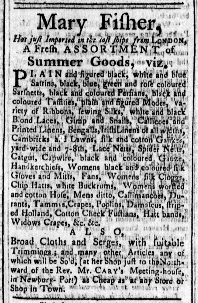 Even as “FREEDOM” promoted “LIBERTY CLOTH” as a symbol of patriotism, merchants and shopkeepers hawked imported goods elsewhere in the newspaper.  No nonimportation or nonconsumption agreement had yet been adopted.  George Searle, for instance, “Just Imported from LONDON … an assortment of Painters Oils and Colours.”  Similarly, John Stickney and Son, announced that they “imported from London, a large assortment of English, India and hard ware GOODS.”  Those goods certainly included garments and fabrics.  Mary Fisher provided more detail, advertising that she “just Imported in the last ships from LONDON, A Fresh ASSORTMENT of Summer Goods.”  She then listed dozens of items, including an array of textiles that ranged from “PLAIN and figured black, white and blue Sattins” to “black, blue green and rose coloured Sarsnetts [sarcenets]” to “Callicoes and Printed Linens.”  Even as such items fell out of favor in some circles, Fisher offered an opportunity for consumers who desired imported textiles, even those who supported the patriot cause, and realized that they should buy what they could before discussions about boycotts became actual boycotts.  Fisher offered her wares “as Cheap as at any Store or Shop in Town,” making it possible for consumers to stockpile items they purchased from her.  Her imported textiles did not have the appearance of homespun “LIBERTY CLOTH,” but, for the moment, customers could at least equivocate that they had not bought those fabrics while a nonconsumption agreement was in effect.  Memories of boycotts in response to the Stamp Act and the duties on certain goods in the Townshend Acts guided consumers in preparing for a new round of protests.