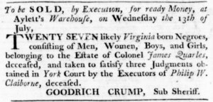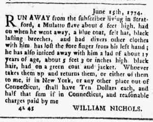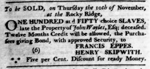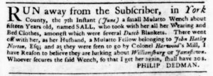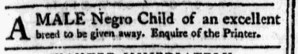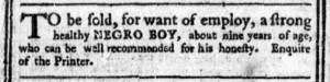 The Slavery Adverts 250 Project chronicles the role of newspaper advertising in perpetuating slavery in the era of the American Revolution. The project seeks to reveal the ubiquity of slavery in eighteenth-century life from New England to Georgia by republishing advertisements about enslaved people – for sale as individuals or in groups, wanted to purchase or for hire for short periods, runaways who liberated themselves, and those who were subsequently captured and confined in jails and workhouses – in daily digests on this site as well as in real time via the @SlaveAdverts250 Twitter feed, utilizing twenty-first-century media to stand in for the print media of the eighteenth century.