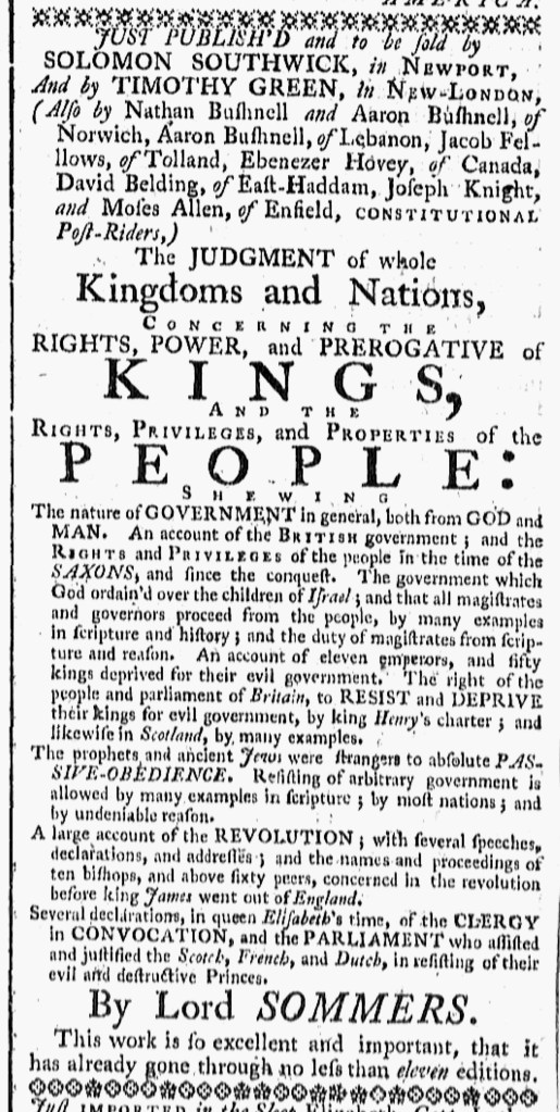 […] the summer of 1774, Solomon Southwick, one of the printers in Spooner’s network of local agents, advertised his edition of The Judgment of Whole Kingdoms and Nations. Readers could acquire copies from him in Newport or from Timothy Green in New London as well […]