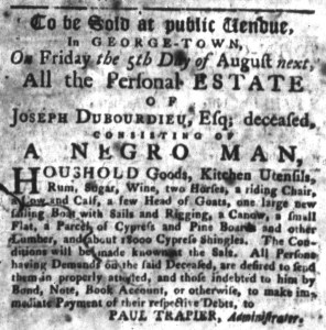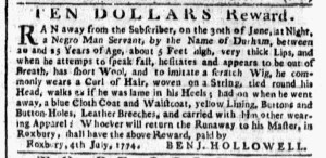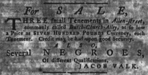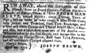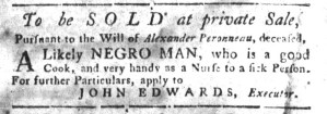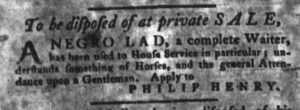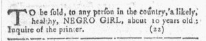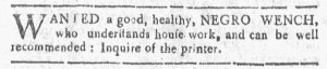The Slavery Adverts 250 Project chronicles the role of newspaper advertising in perpetuating slavery in the era of the American Revolution. The project seeks to reveal the ubiquity of slavery in eighteenth-century life from New England to Georgia by republishing advertisements about enslaved people – for sale as individuals or in groups, wanted to purchase or for hire for short periods, runaways who liberated themselves, and those who were subsequently captured and confined in jails and workhouses – in daily digests on this site as well as in real time via the @SlaveAdverts250 Twitter feed, utilizing twenty-first-century media to stand in for the print media of the eighteenth century.