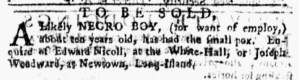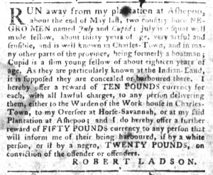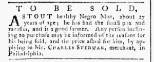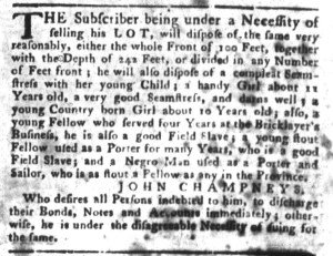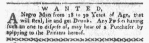 The Slavery Adverts 250 Project chronicles the role of newspaper advertising in perpetuating slavery in the era of the American Revolution. The project seeks to reveal the ubiquity of slavery in eighteenth-century life from New England to Georgia by republishing advertisements about enslaved people – for sale as individuals or in groups, wanted to purchase or for hire for short periods, runaways who liberated themselves, and those who were subsequently captured and confined in jails and workhouses – in daily digests on this site as well as in real time via the @SlaveAdverts250 Twitter feed, utilizing twenty-first-century media to stand in for the print media of the eighteenth century.