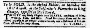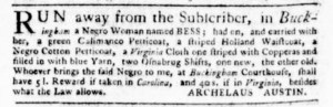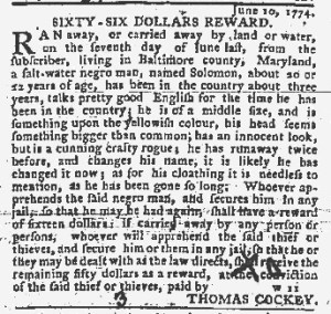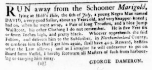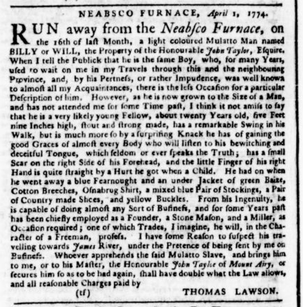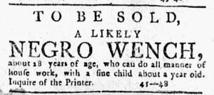 The Slavery Adverts 250 Project chronicles the role of newspaper advertising in perpetuating slavery in the era of the American Revolution. The project seeks to reveal the ubiquity of slavery in eighteenth-century life from New England to Georgia by republishing advertisements about enslaved people – for sale as individuals or in groups, wanted to purchase or for hire for short periods, runaways who liberated themselves, and those who were subsequently captured and confined in jails and workhouses – in daily digests on this site as well as in real time via the @SlaveAdverts250 Twitter feed, utilizing twenty-first-century media to stand in for the print media of the eighteenth century.