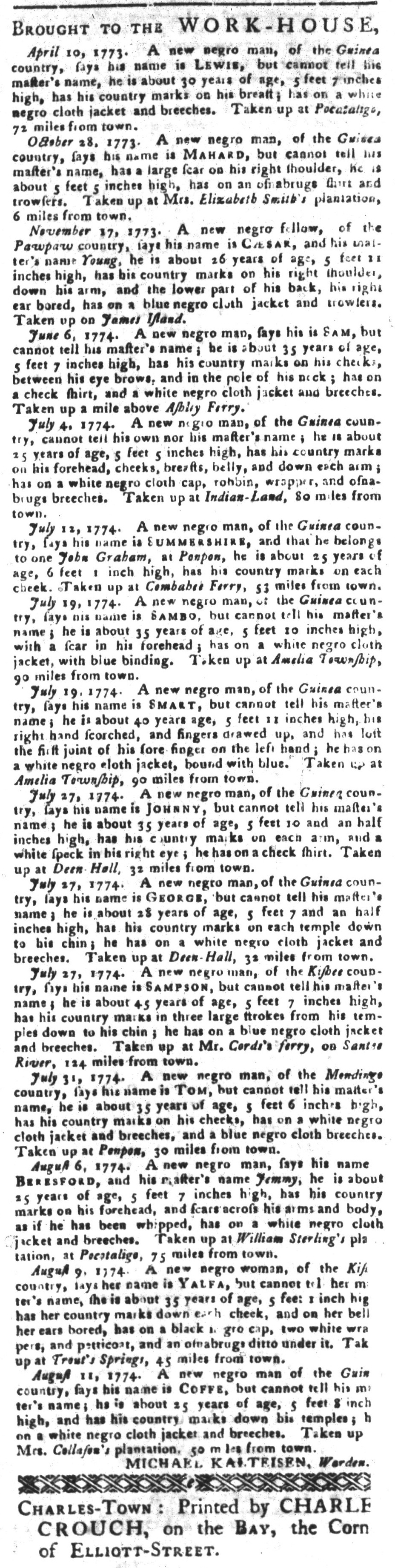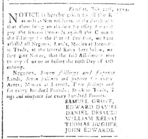 Yet his intentions had been thwarted so far because “the different Presses in this city are at present engaged with political matters.” Hume had apparently shopped around to Dunlap’s Pennsylvania Packet, the Pennsylvania Gazette, and the Pennsylvania Journal, but none of the printers chose to accept his narrative for publication in their newspapers. Whatever their reasons for rejecting it, they invoked current events as justification. In recent months the imperial crisis intensified as the colonies received word of the Boston Port Act, the Massachusetts Government Act, and the other Coercive Acts passed as punishment for the Boston Tea Party. Parliament sought to restore order, but many colonizers believed their liberties as English subjects were under attack. For his part, Hume had his own concerns about his “right to claim the privileges of an American subject, and the laws of the land for justice, in punishing this villain Rodgers, for his inhuman treatment to me.” That incident, however, did not rise to the level that printers in Philadelphia gave priority to publishing it. Hume circumvented their editorial decisions, at least in part, by including his allegations against Rodgers in a paid notice, thus raising an alarm that others needed to be cautious when interacting with the ferry operator.