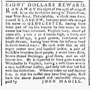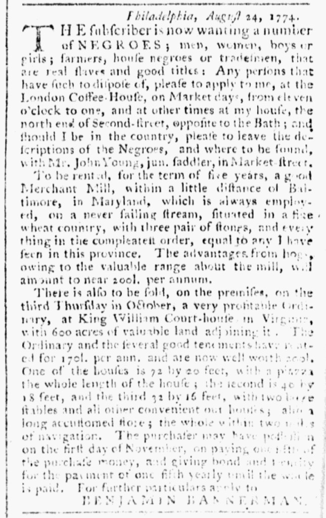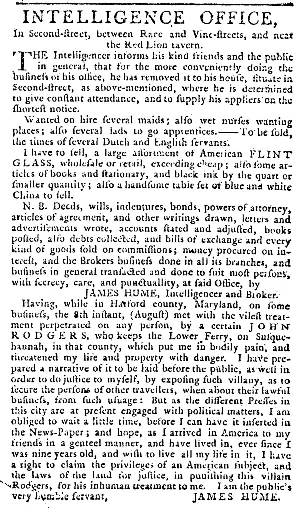 On the same day, James Hume published a lengthy advertisement with two very different purposes in the Pennsylvania Journal. The headline declared, “INTELLIGENCE OFFICE.” The broker described the various services he provided, including drawing up “Deeds, wills, indentures, bonds, powers of attorney, [and] articles of agreement.” He had “wet nurses wanting places” as well as “several lads to go apprentices.” He recorded and settled accounts, sold goods on commission, and even wrote advertisements on behalf of his clients. Rather than focus exclusively on his work as an “Intelligencer and Broker,” Hume used his access to the public prints to air a grievance against John Rodgers, “who keeps the Lower Ferry on Susquehannah” in Harford County, Maryland. According to the Hume, he was the victim of “the vilest treatment perpetrated on any person … which put me in bodily pain, and threatened my life and property with danger.” Following that ordeal, he “prepared a narrative of it to be laid before the public,” which he depicted as a service to the public. By “exposing such villainy” and warning others about Rodgers, he hoped to “secure the persons of other travellers, when about their lawful business, from such usage.”