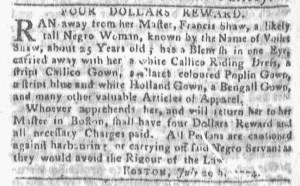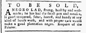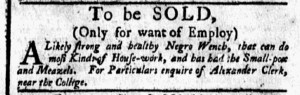 The Slavery Adverts 250 Project chronicles the role of newspaper advertising in perpetuating slavery in the era of the American Revolution. The project seeks to reveal the ubiquity of slavery in eighteenth-century life from New England to Georgia by republishing advertisements about enslaved people – for sale as individuals or in groups, wanted to purchase or for hire for short periods, runaways who liberated themselves, and those who were subsequently captured and confined in jails and workhouses – in daily digests on this site as well as in real time via the @SlaveAdverts250 Twitter feed, utilizing twenty-first-century media to stand in for the print media of the eighteenth century.