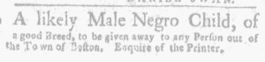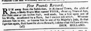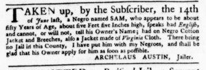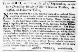 The Slavery Adverts 250 Project chronicles the role of newspaper advertising in perpetuating slavery in the era of the American Revolution. The project seeks to reveal the ubiquity of slavery in eighteenth-century life from New England to Georgia by republishing advertisements about enslaved people – for sale as individuals or in groups, wanted to purchase or for hire for short periods, runaways who liberated themselves, and those who were subsequently captured and confined in jails and workhouses – in daily digests on this site as well as in real time via the @SlaveAdverts250 Twitter feed, utilizing twenty-first-century media to stand in for the print media of the eighteenth century.
